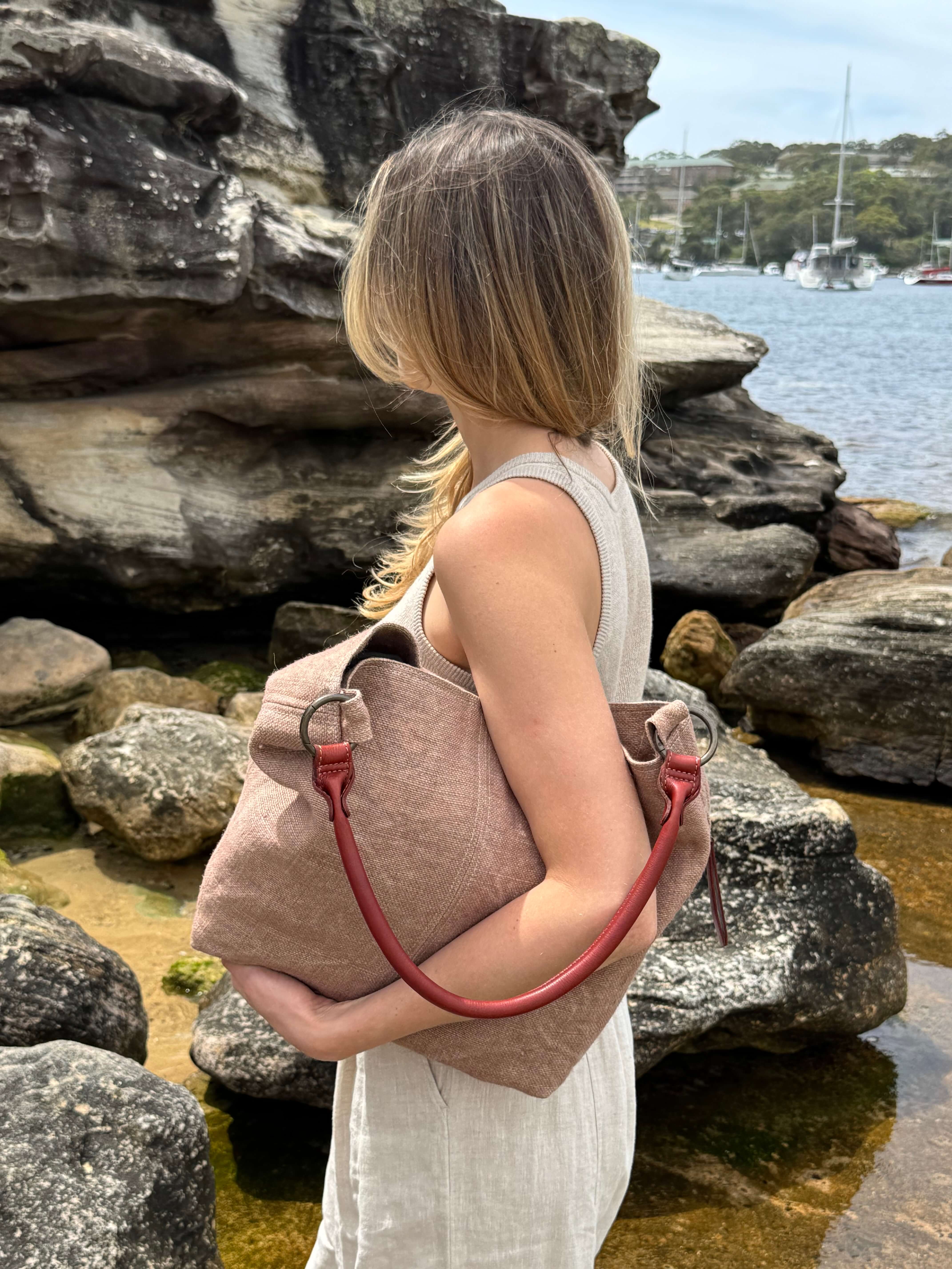 To clean the jute portion of the bag, first remove the leather handles by opening the spring release O-ring.