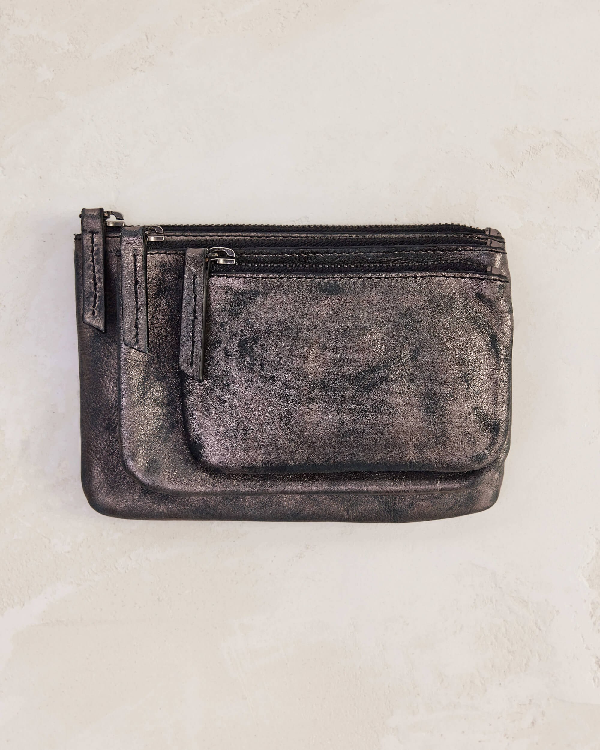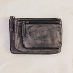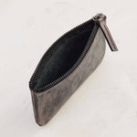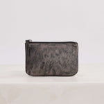 W15cm H10cm, unlined leather, zipper closure, pewter grey