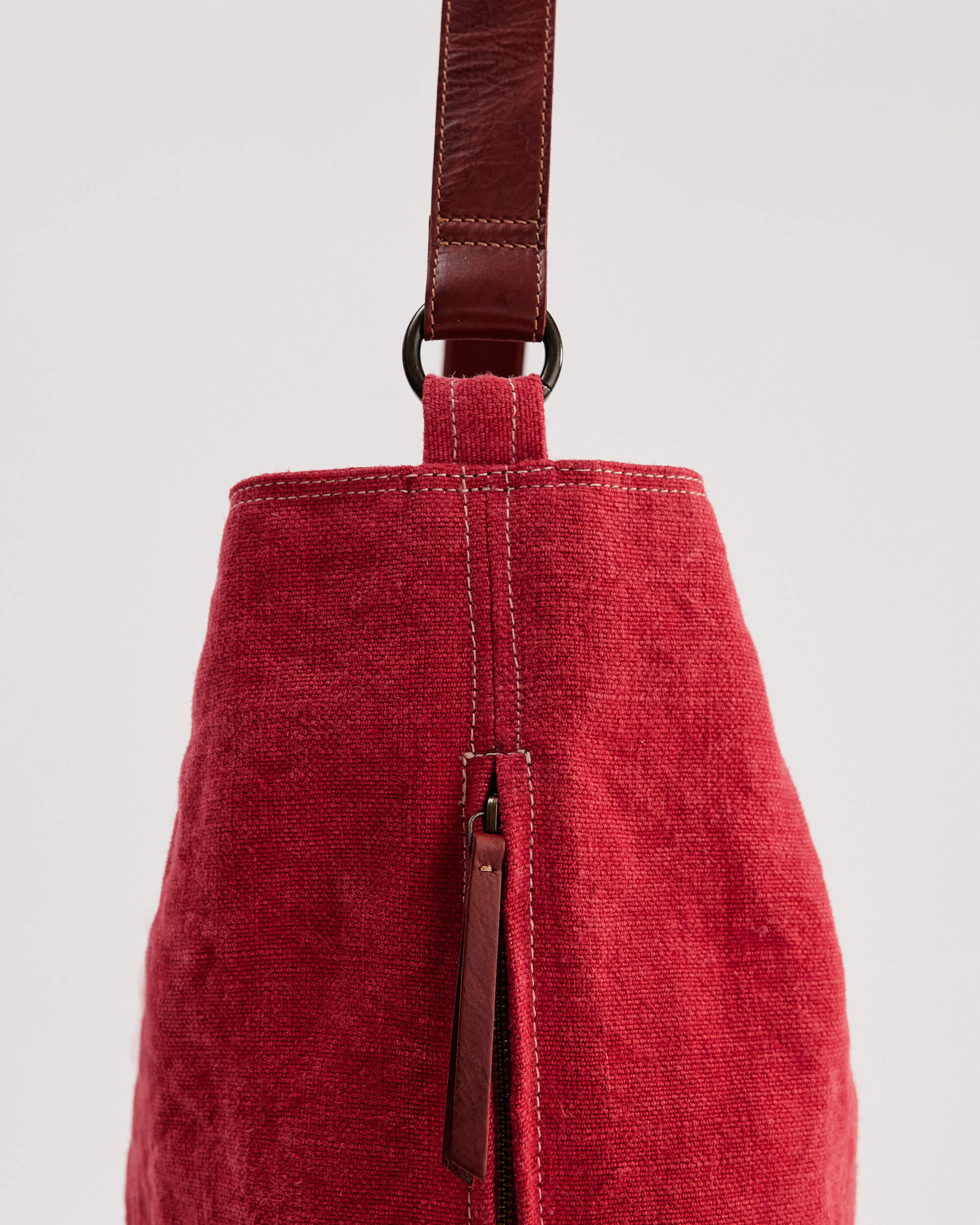 To clean the jute portion of the bag, first remove the leather handles by opening the spring release O-ring.