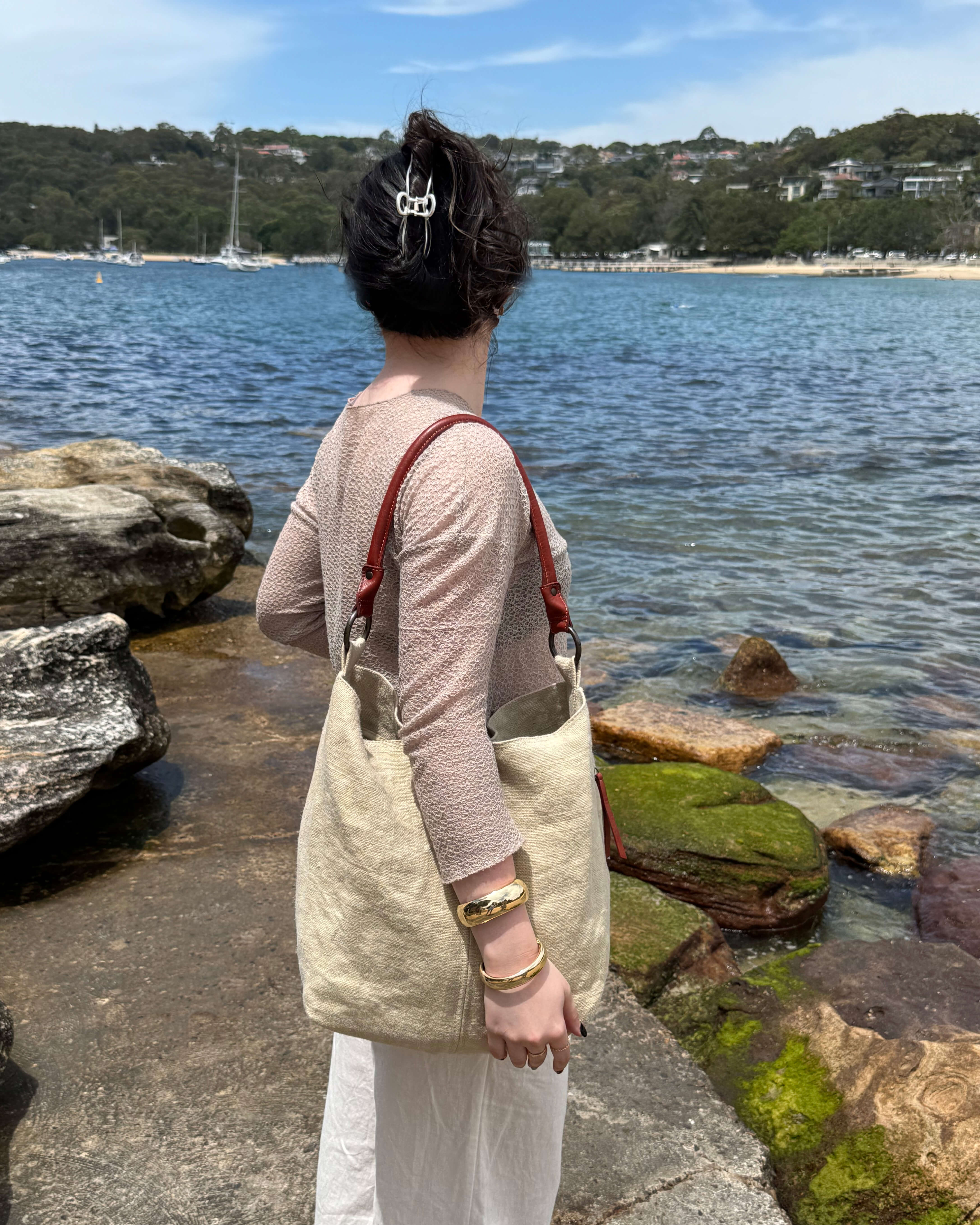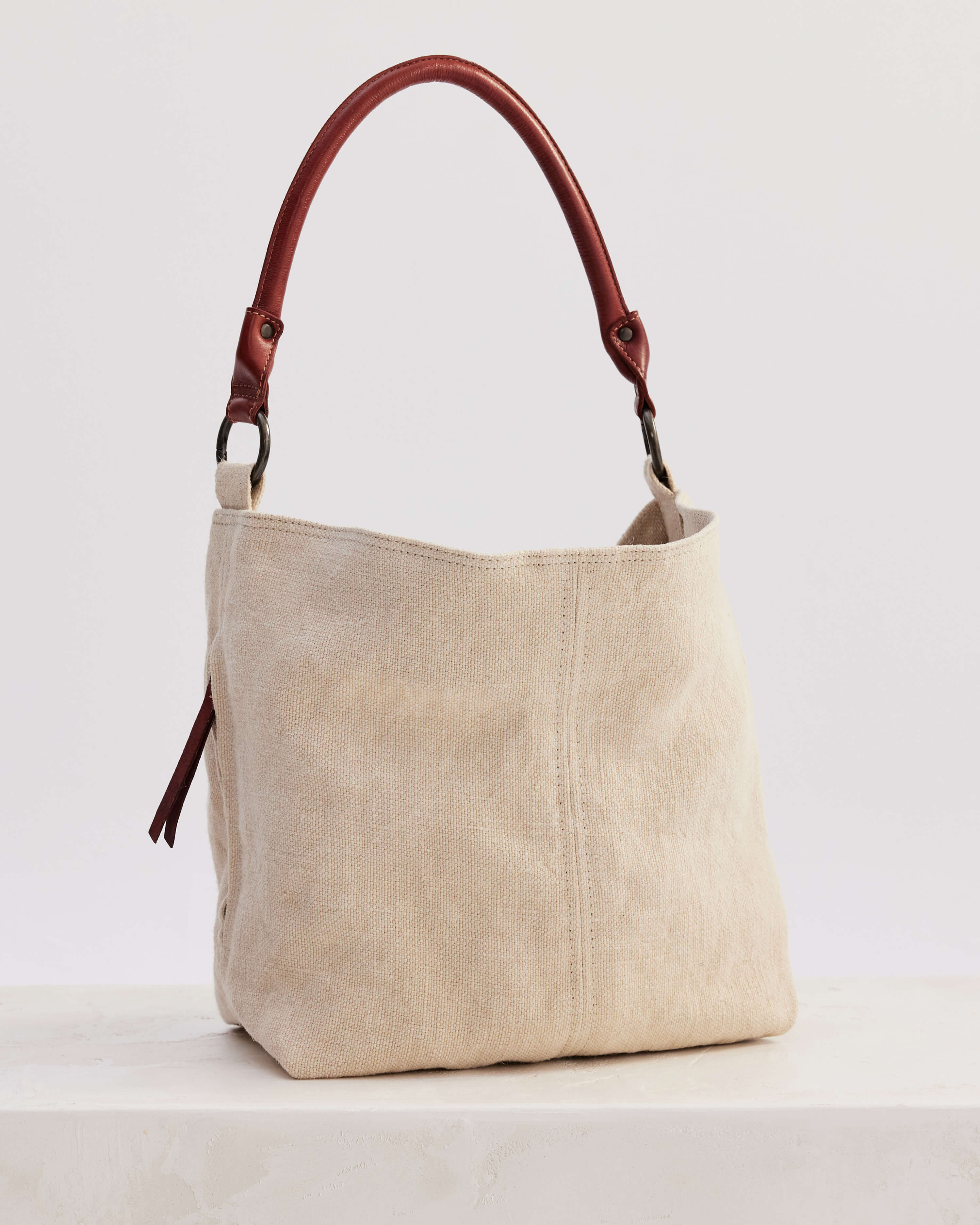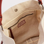 To clean the jute portion of the bag, first remove the leather handles by opening the spring release O-ring.