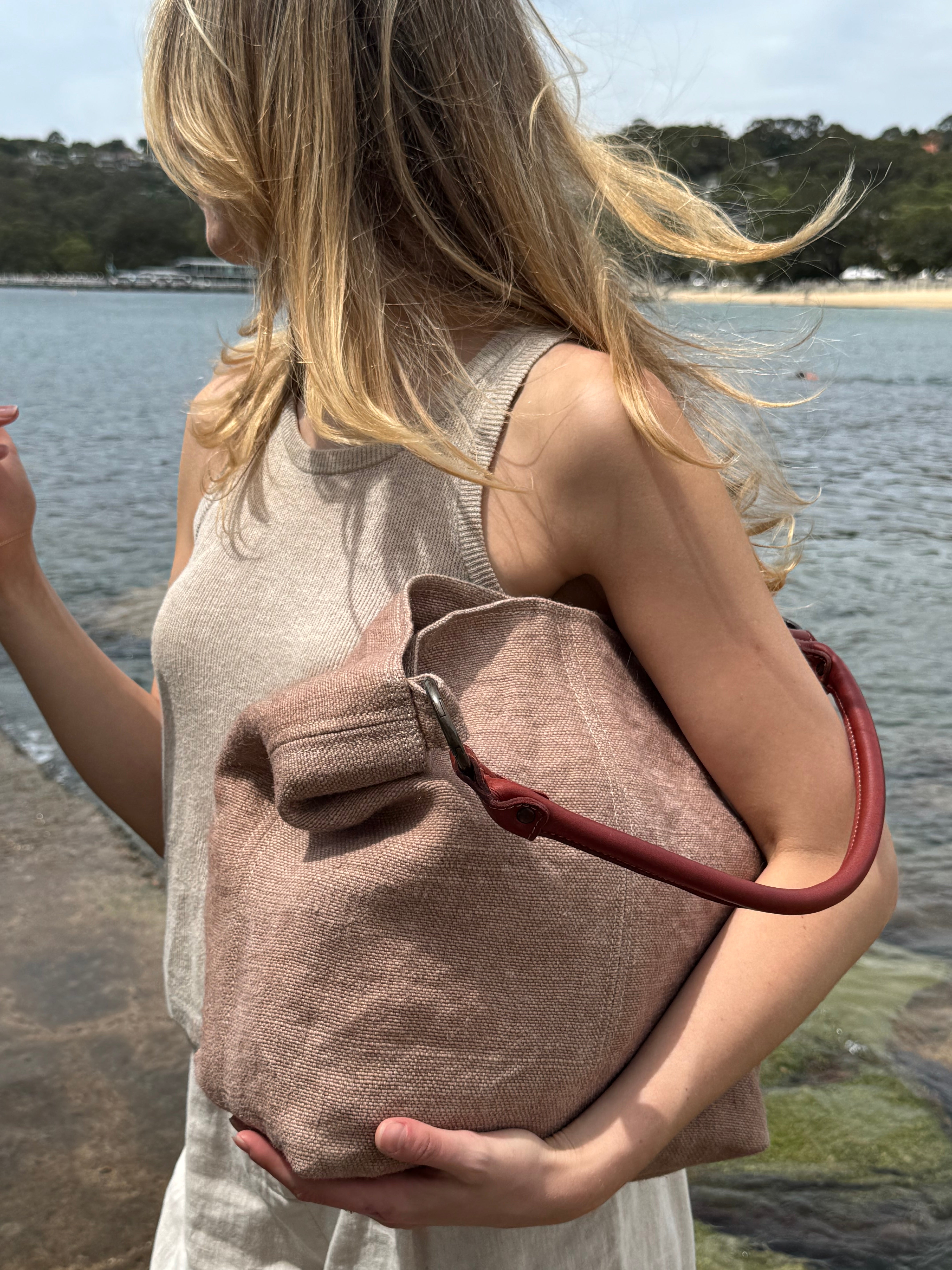 To clean the jute portion of the bag, first remove the leather handles by opening the spring release O-ring.