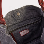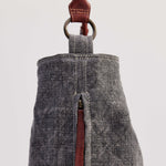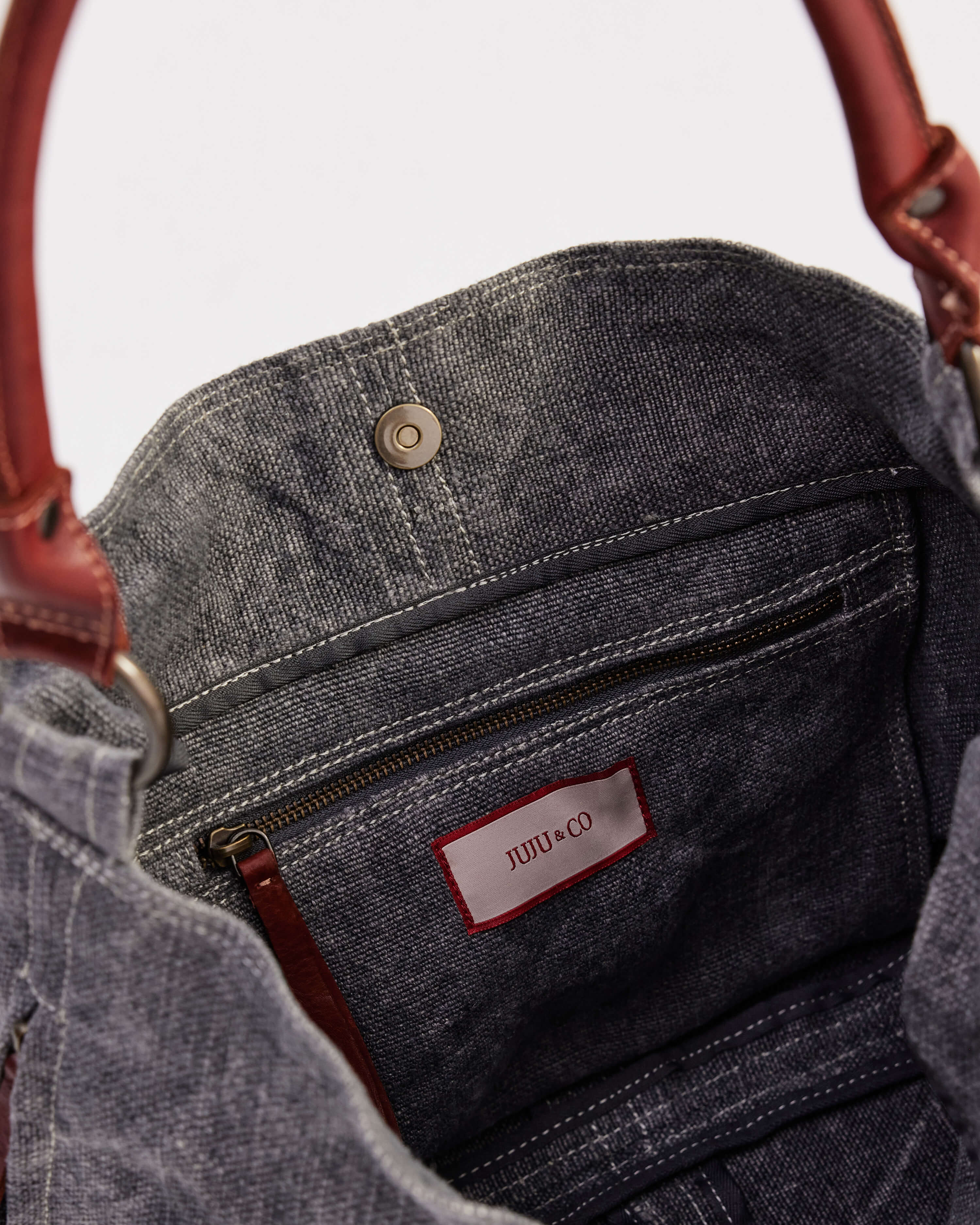 To clean the jute portion of the bag, first remove the leather handles by opening the spring release O-ring.