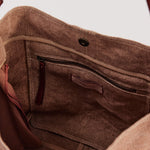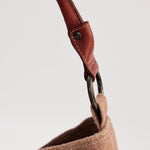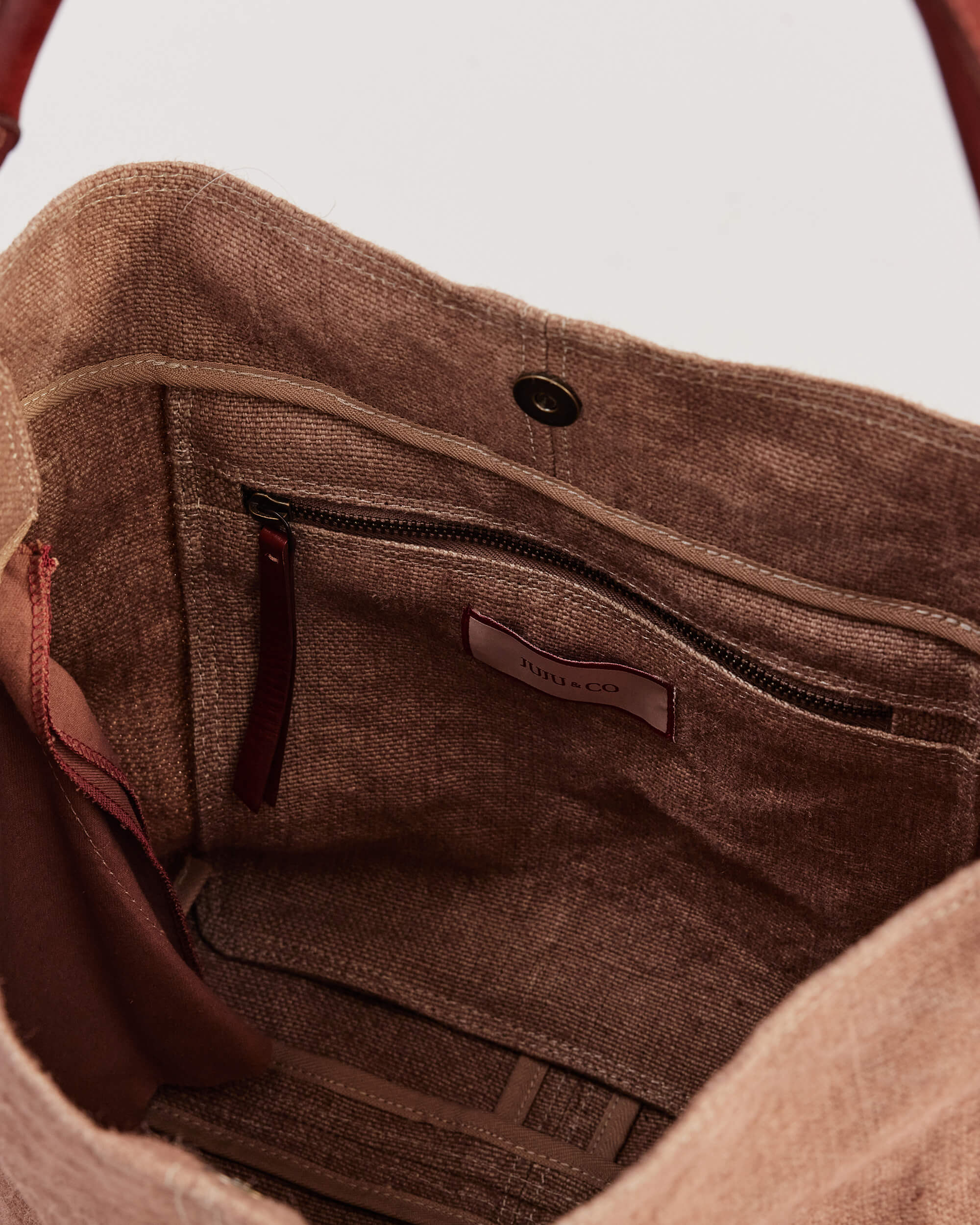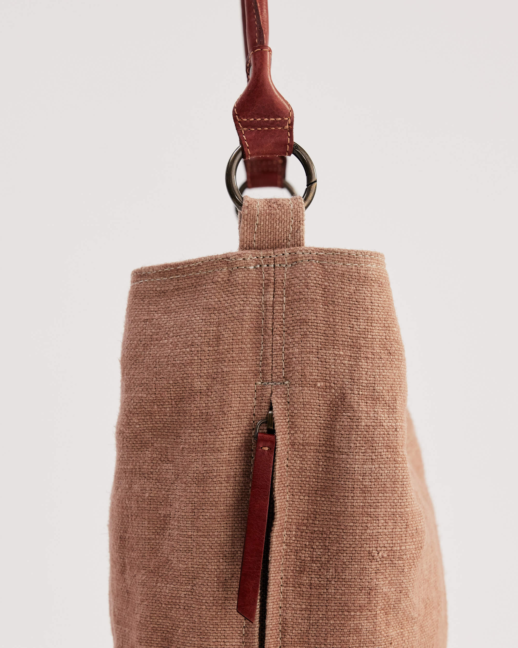 To clean the jute portion of the bag, first remove the leather handles by opening the spring release O-ring.