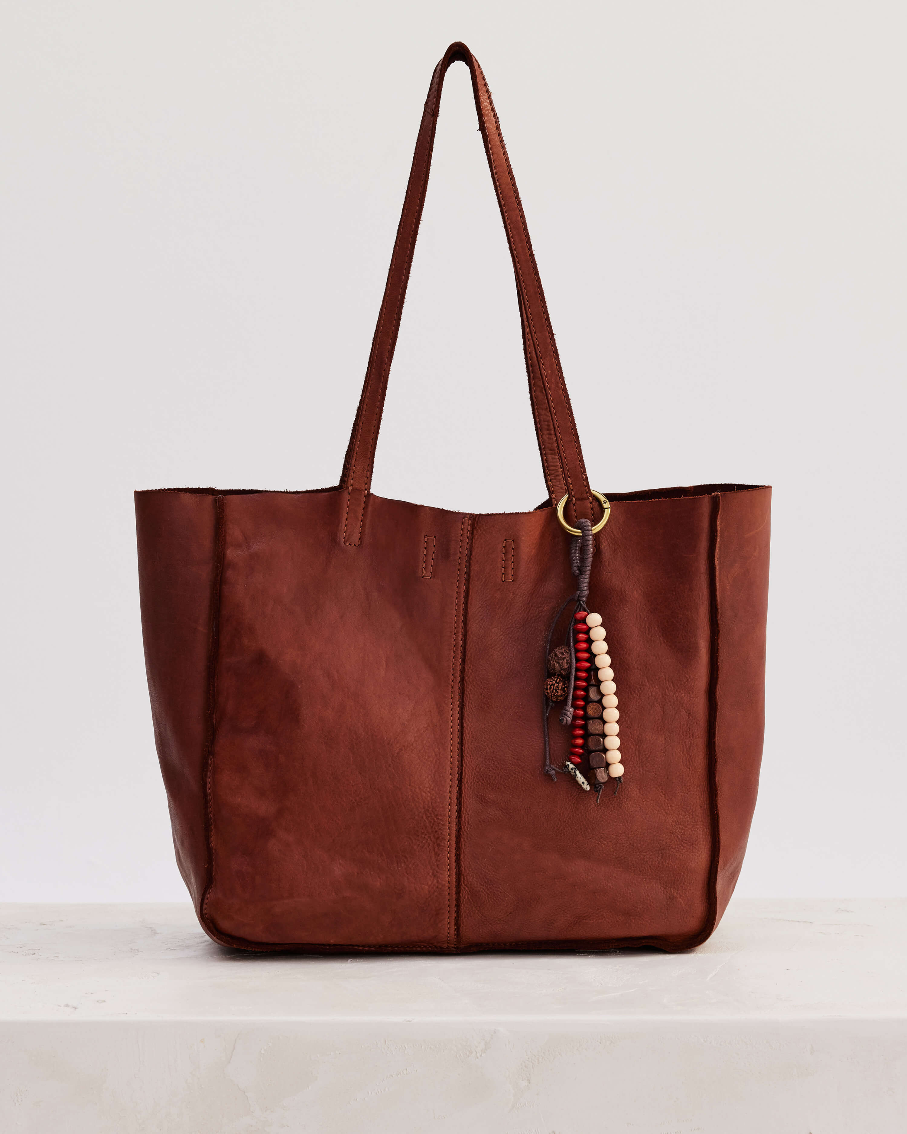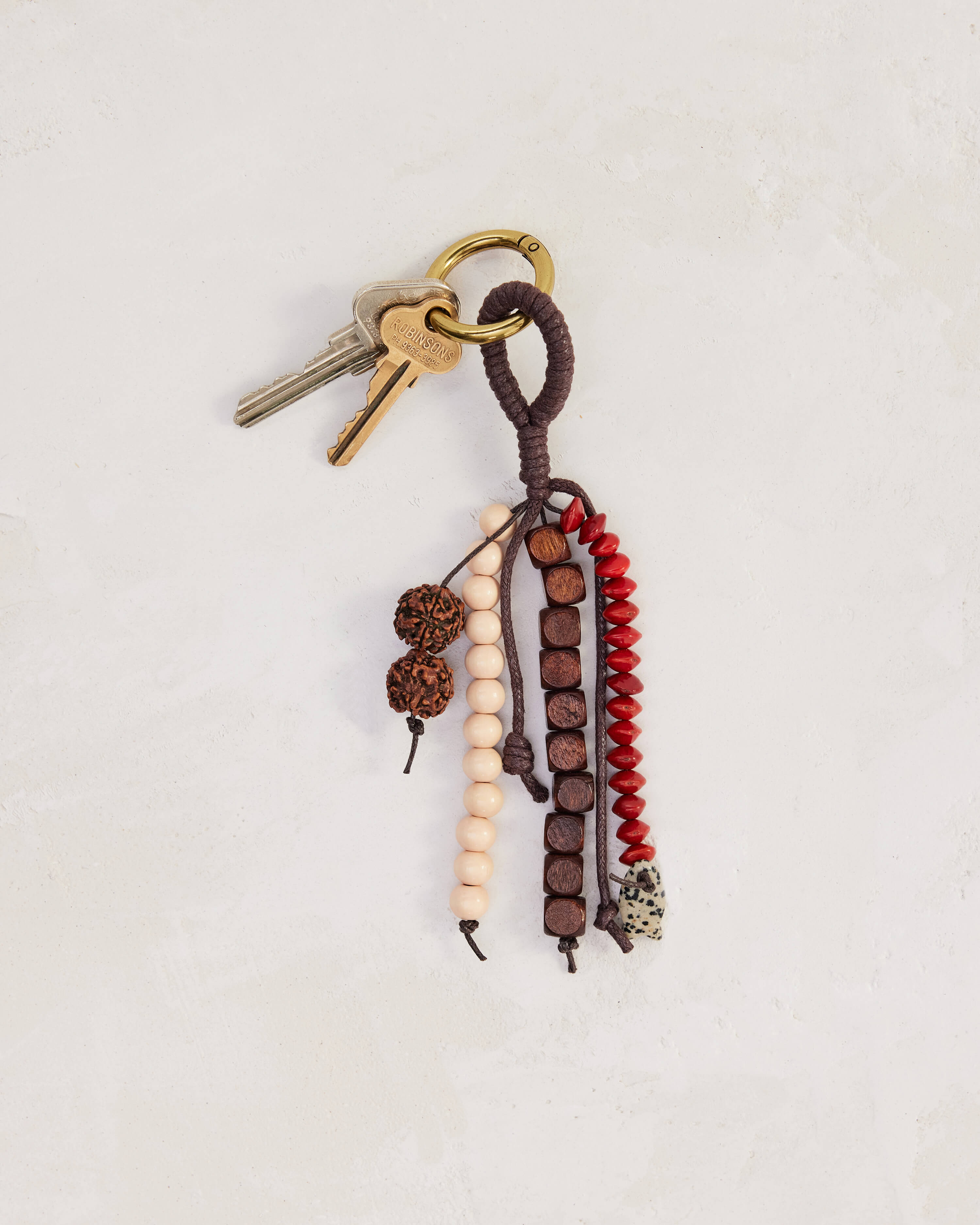 The Lucky Fish Charm in Chocolate clips easily onto your favourite accessory, adding a touch of texture and meaning. Handcrafted from mixed wooden beads, natural seed pods, and a hand-carved Dalmatian Jasper fish pendant, each piece is tied together with waxed cotton thread and finished with a secure o-ring clasp.