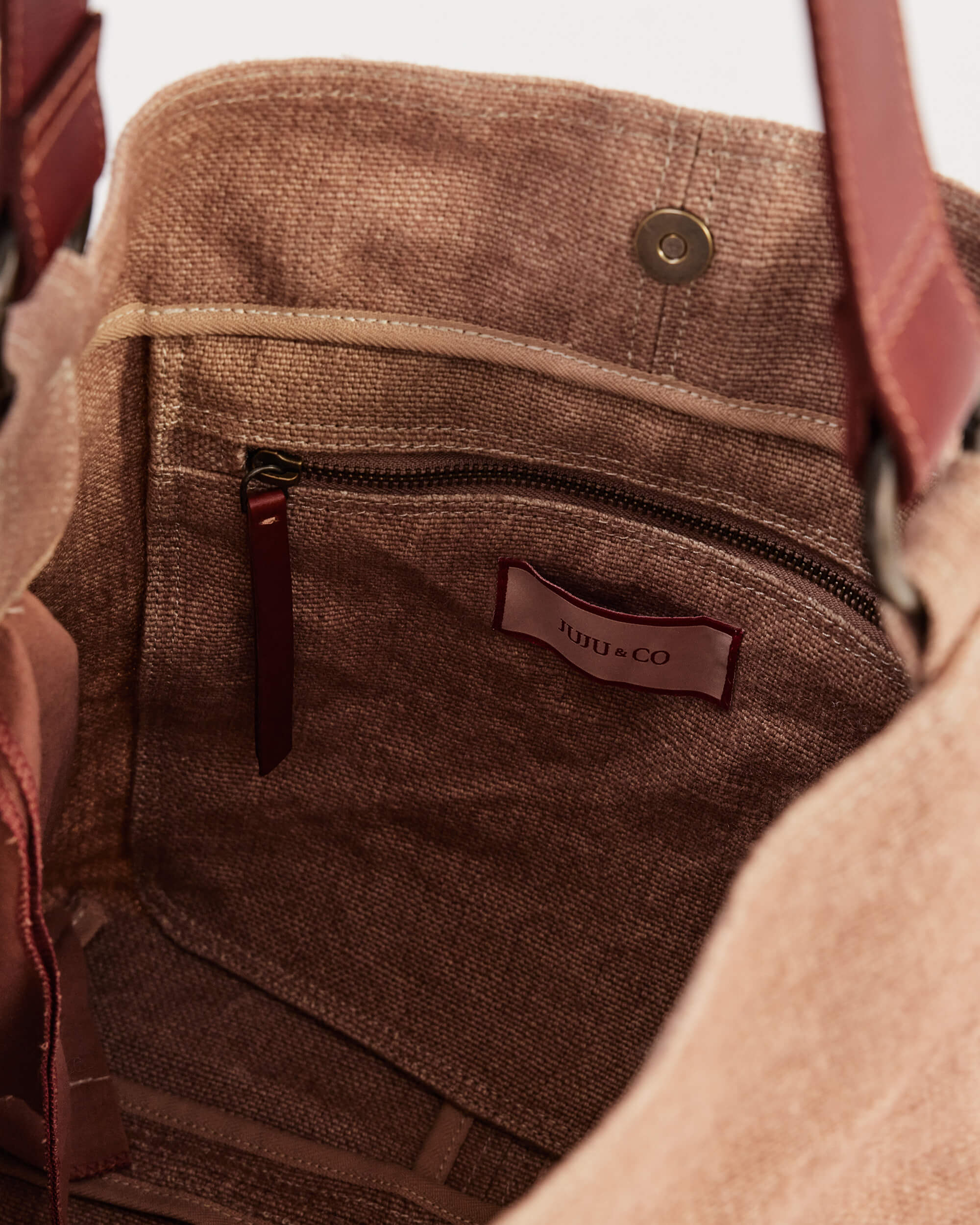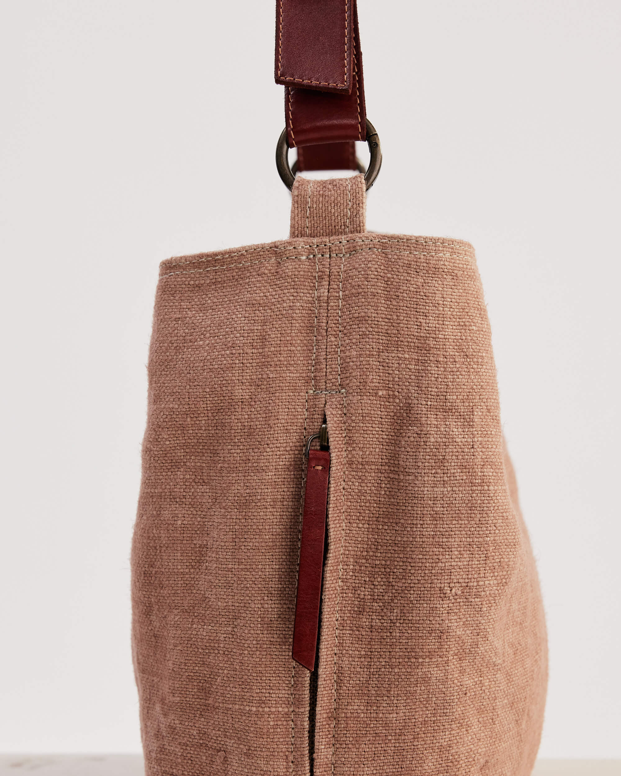 To clean the jute portion of the bag, first remove the leather handles by opening the spring release O-ring.